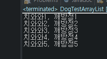 Q4에서 DogTestArrayList 클래스를 만들어 멤버 변수로 ArrayList를 사용. Dog인스턴스를 5개 생성하여 ArrayList에 추가하고 ArrayList의 정보를 출력하는 코드를 작성.