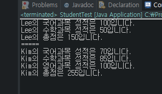 테스트 클래스에서 학생 두 명을 생성하고 각 학생의 과목별 성적과 총점을 출력해보자.