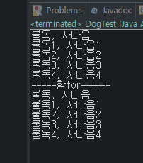 다음과 같이 Dog클래스가 있다. DogTest클래스와 배열 길이가 5인 Dog[]배열을 만든 후 Dog인스턴스를 5개 생성하여 배열에 추가. for문과 향상된 for문에서 Dog클래스의 showDogInfo()메서드를 사용하여 배열에 추가한 Dog 정보를 모두 출력하시오.