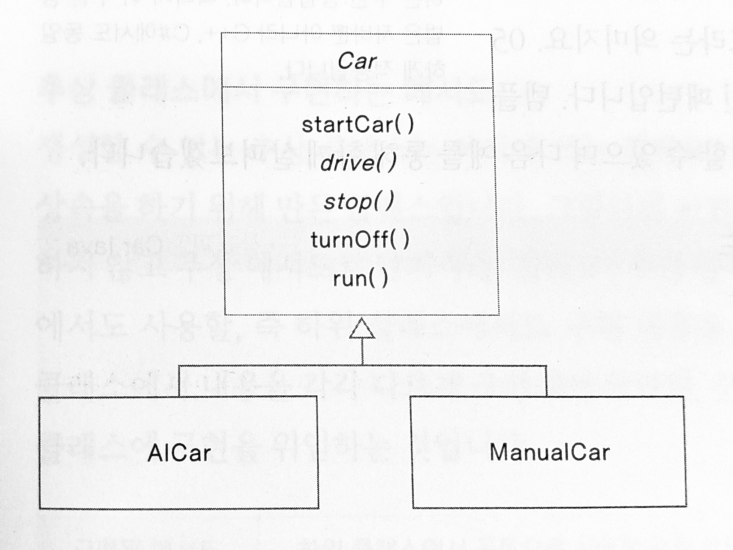 자율주행차(AICar)와 일반차(ManualCar) 두 개가 Car를 상속받는다.