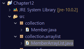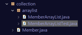 collection 패키지 하위에 arraylist패키지를 만들고 MemberArrayList.java 클래스를 생성하면 패키지의 계층 구조가 아래처럼 보인다.