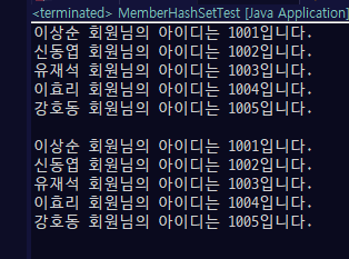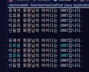 먼저 MemberHashSet을 생성해 회원 집합을 추가하고, 기존에 추가된 회원과 아이디가 같은 회원을 추가해 보자.