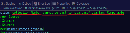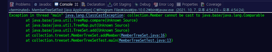 위 출력 화면에서 오류메시지를 잘 확인하면 Member 클래스가 Comparable 인터페이스를 구현하지 않았다는 내용이 있다.