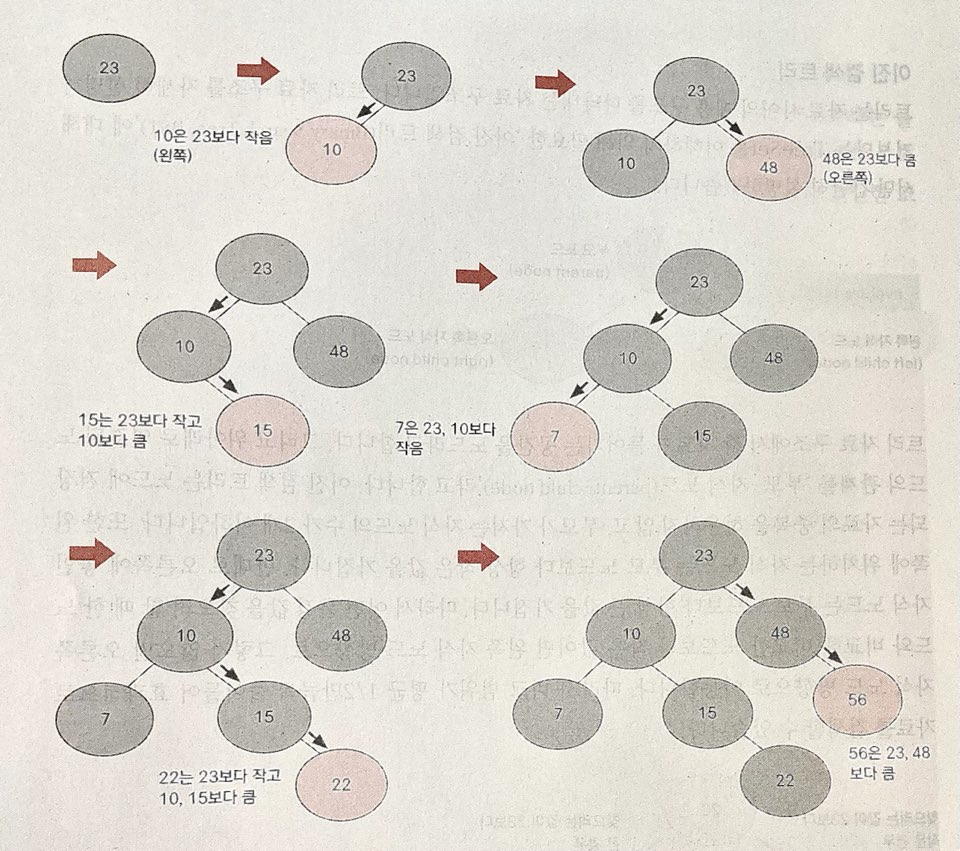위 순서로 숫자를 입력한다고 할 때 트리가 만들어지는 모양은 다음과 같다.