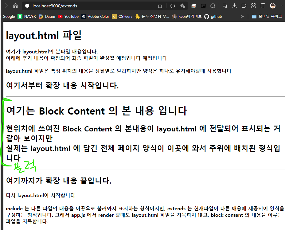 <h4>include 는 다른 파일의 내용을 이곳으로 불러와서 표시하는 형식이지만, extends 는 현재파일이 다른 애용에 제공되어 양식을 구성하는 형식입니다. 그래서 app.js 에서 render 할때도 layout.html 파일을 지목하지 않고, block content 의 내용을 이루는 파일을 지목합니다.</h4>