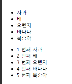 {% set fruits=['사과','배','오렌지','바나나','복숭아'] %} <!--넌적스 배열 생성-->